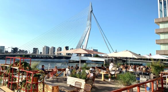 Het grote verhoogde terras lijkt op de Maas te zweven en biedt mogelijkheid voor gezellige borrels en uitstekende diners. Maar bijvoorbeeld ook voor een huwelijksceremonie met de Erasmusbrug als getuige.